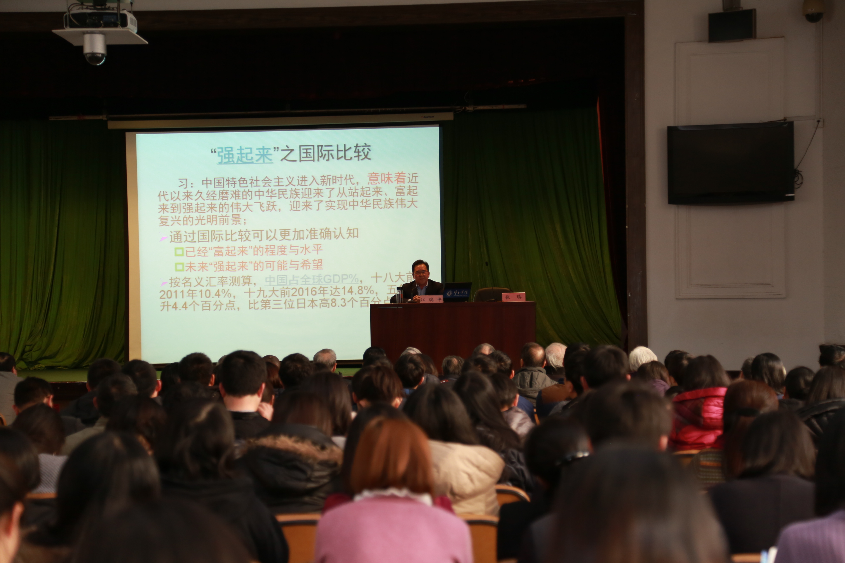 江瑞平副院长围绕“从国际定位看历史方位、如何走近世界舞台中央、时代主题与中国新时代、从逆全球化到新全球化、两大构建主导外交布局、六大趋向引领开放格局”六大方面,结合历史与现实,通过翔实的数据和事例,深入浅出地解读了十九大报告的有关内涵和意义。