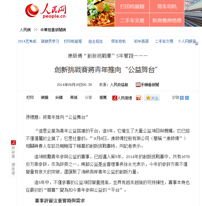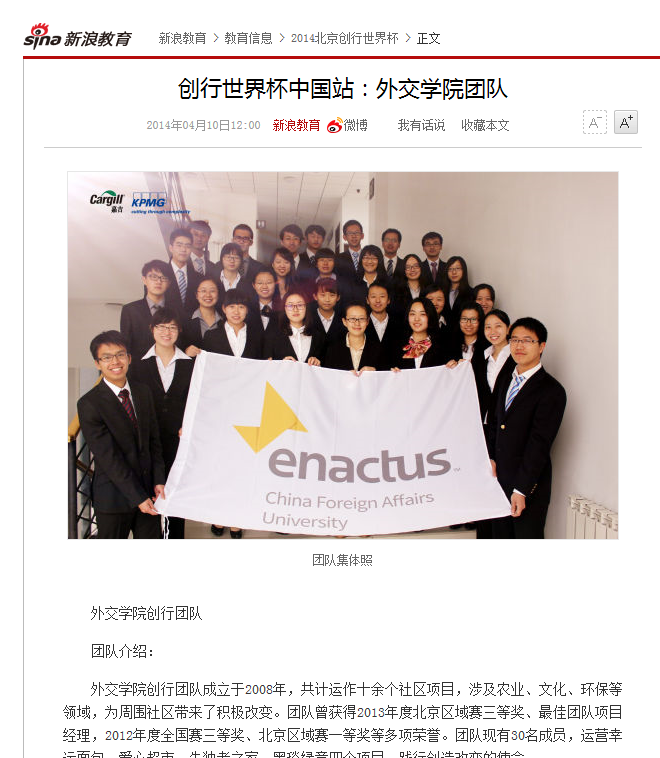 创行成立于1975年,是一个遍布全球高校的具有企业家精神的国际性组织,我校于2008年成立beat365官方网站创行团队,一直受学生处就业指导中心的支持。2014年“康师傅创新挑战赛”于3月份启动,以“小公益,大改变”为主题,赛事吸引了来自海峡两岸22座城市33所高校逾6000名学生参与。我校创行团队积极参与,针对近年来有关食品浪费的问题,结合实践经验,通过沟通、合作,实现了商业价值与社会公益的有机结合,赢得了众评委的青睐。