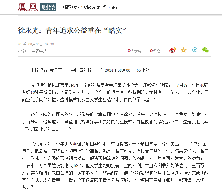 近日,我校社团联合会下属精鹰社创行团队”幸运面包”项目参加康师傅创新挑战赛,获创新挑战赛2014年度冠军。beat365本科国际经济学院大三学生张介然荣获“2014康师傅创新挑战赛公益达人”称号,获奖团队不仅获得5万元青年公益项目实践奖金,还将参访美国百事基金会。