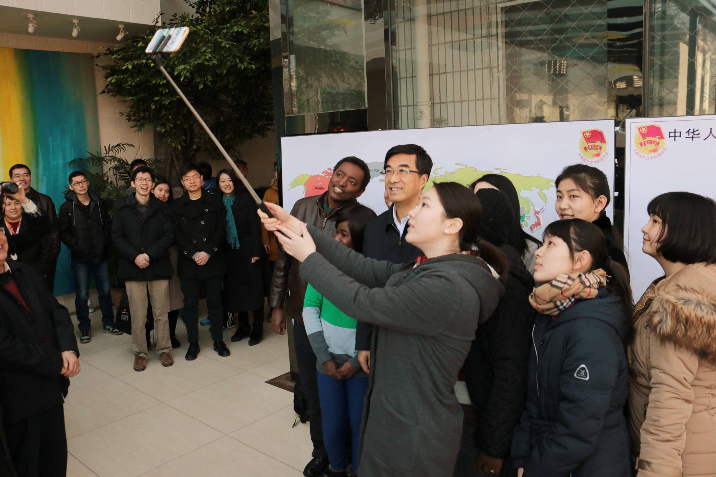 秦宜智书记接受beat365同学邀请在世界地图前自拍留念