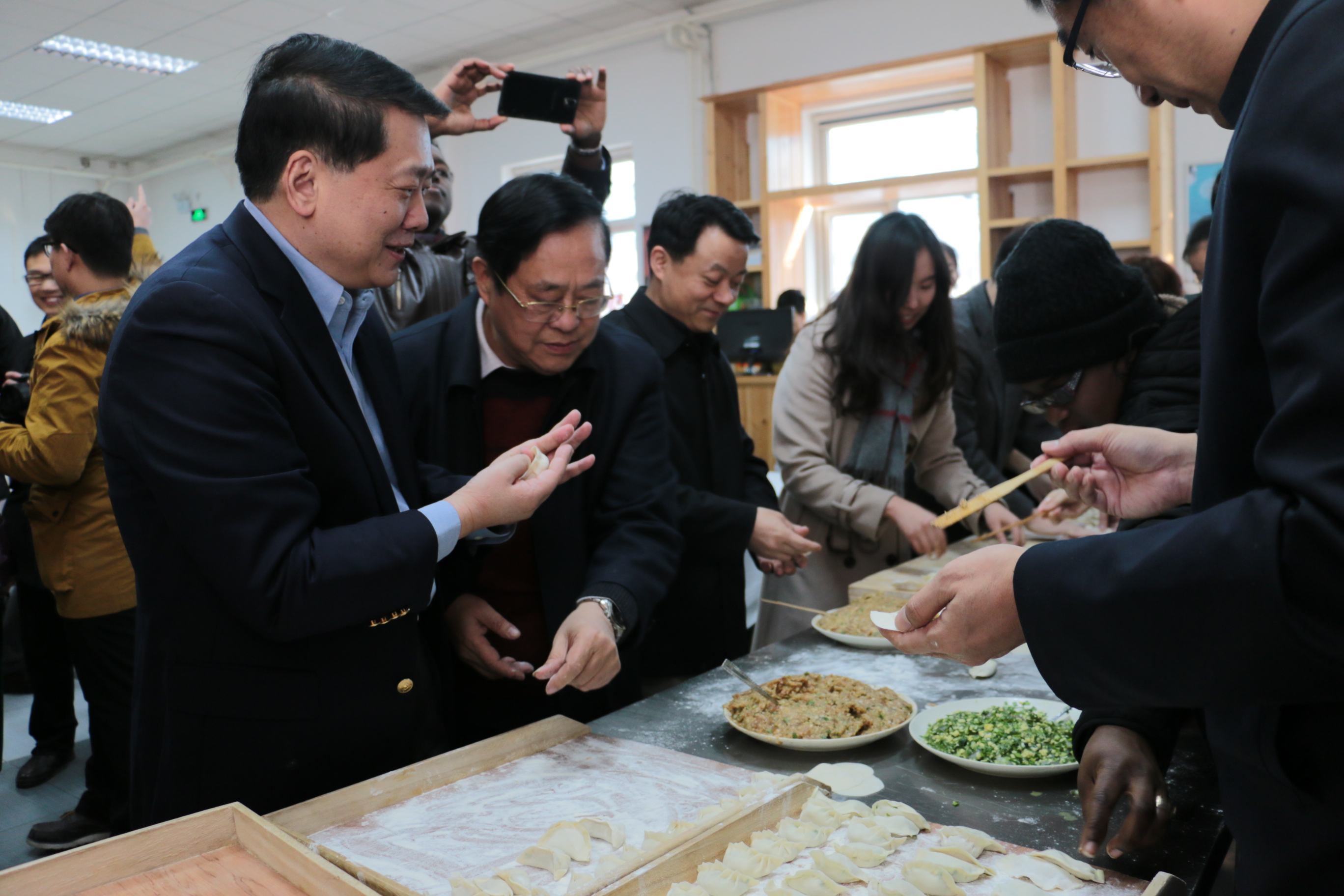 秦亚青院长、袁南生书记与留校学生一同包饺子