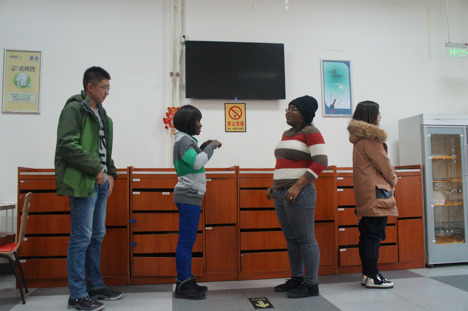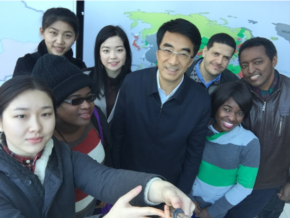 来自埃塞俄比亚的留学生亚当向秦书记讲述了自己在华的学习生活情况。他说:“中国的外交政策让非洲受益很多,我们非常感激。”秦宜智书记表示,中国和非洲国家的合作是双赢的合作,希望留学生们可以好好学习中文,为中非关系尽自己的一份力。一起交流的还有来自加纳和哈萨克斯坦等国的留学生,秦宜智书记用英语和他们拉起家常,教他们说简单的中文。