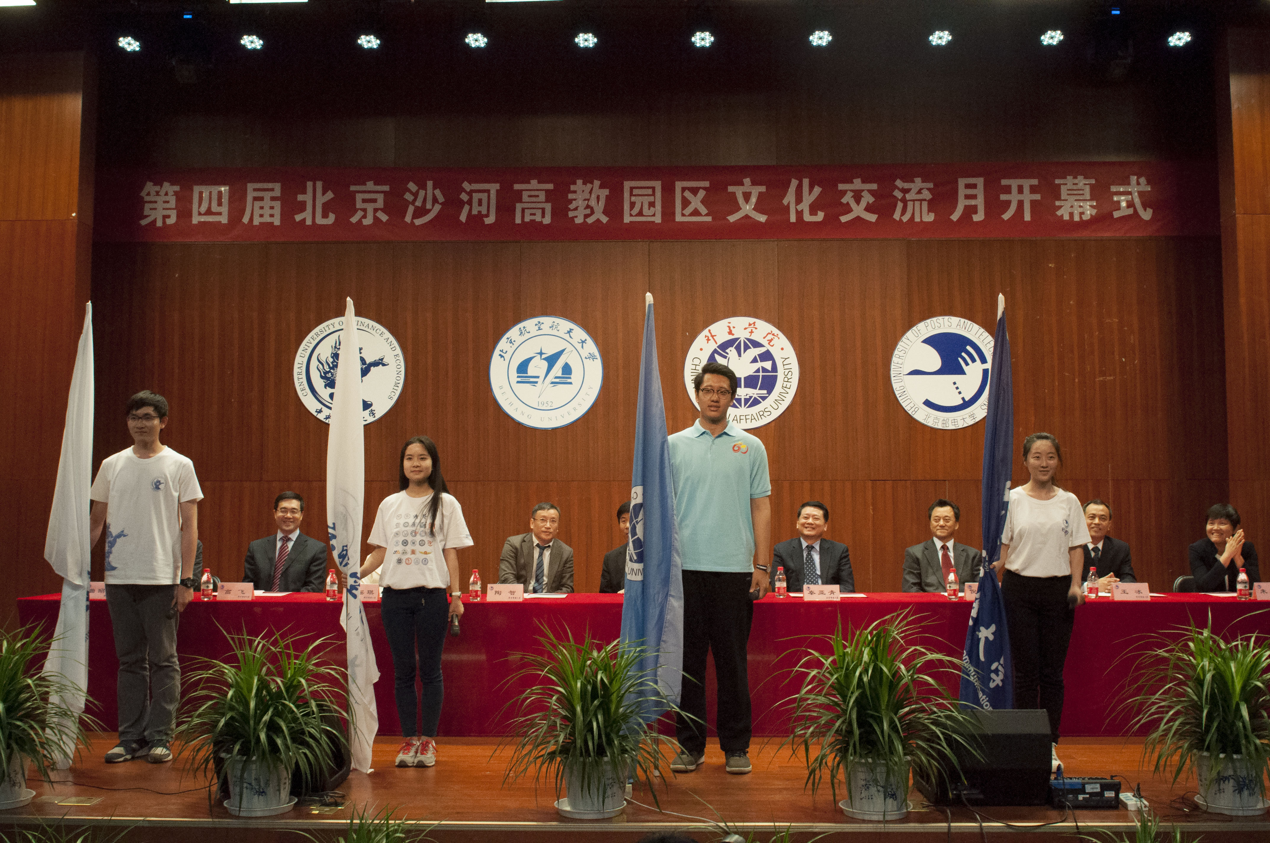 随后,四校学生代表上台挥舞校旗,代表全体同学表达了对四校文化交流月活动的良好祝愿。校领导们共同点亮了象征四校友谊之树,第四届北京沙河高教园区文化交流月正式开幕。
