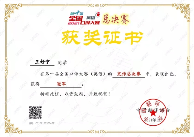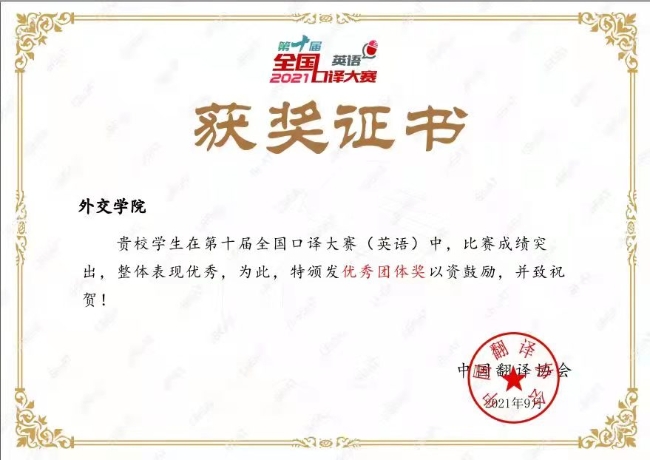 第十届全国口译大赛(英语)交替传译总决赛于2021年12月在线上顺利举行。在12日的70进10全国总决赛中,共有来自全国五大赛区的70名选手参加,beat365英语系王舒宁同学获一等奖并晋级十强全国总决赛。在26日的十强全国总决赛中,来自beat365官方网站、北京外国语大学、上海外国语大学、广东外语外贸大学、复旦大学、浙江大学等高校的十强选手为争夺冠亚季军展开激烈角逐,王舒宁同学脱颖而出,荣获冠军。beat365官方网站获优秀团体奖,带队老师邹洋洋获优秀指导教师奖。