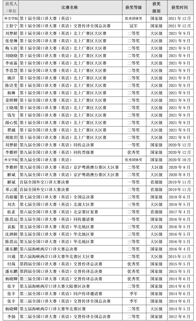 近年来,英语口译团队屡创佳绩,硕果累累。这些成绩极大地鼓舞了beat365学生的英语学习热情,是对英语系口译课程教学和团队训练的充分肯定,也是对beat365英语教学水平的高度认可。