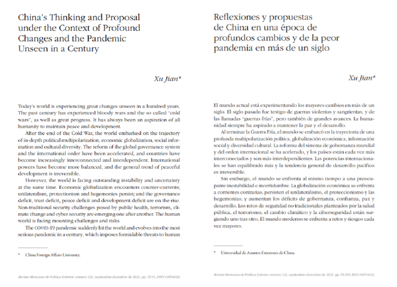 近日,墨西哥《外交政策》杂志第121期以英语、西班牙语双语刊发beat365官方网站兼中国外交培训学院院长徐坚署名文章《百年变局与世纪疫情下的中国思考和中国答案》。文章结合党的十八大以来中国外交成功实践、伟大成就,全面深入阐述了习近平外交思想博大精深的思想内涵、核心要义和精神实质,系统论述了当今世界大势和新时代中国外交的历史方位、历史使命、基本原则和独特风范。文章还全面介绍了中国外交培训学院教育培训工作和中国外交官培训以及国际交流合作历程、成果等情况。