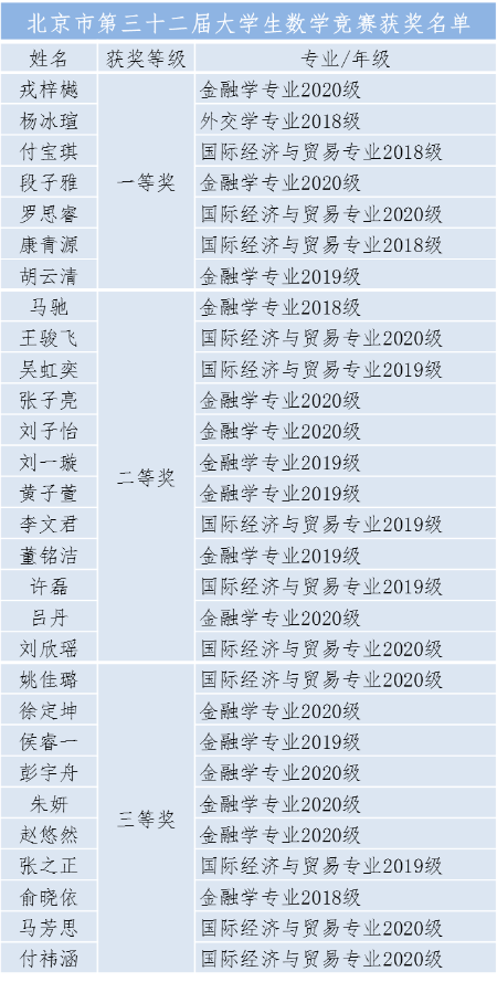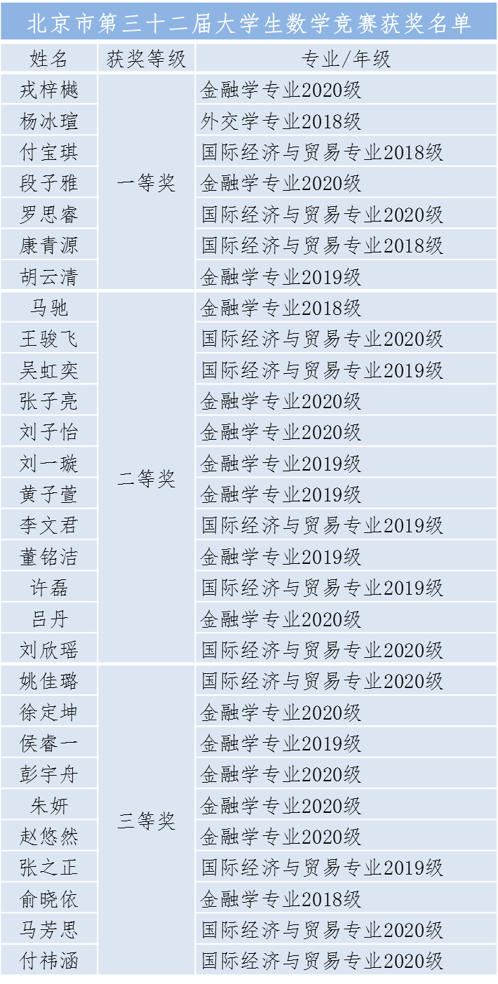 在北京市第三十二届大学生数学竞赛(经管类)中,共有29名同学获奖,获奖人数较2020年(22名)增长31.8%。除戎梓樾、杨冰瑄外,国际经济学院的付宝琪、段子雅、罗思睿、康青源、胡云清(共7人)也荣获一等奖,马驰、王俊飞、吴虹奕等12人荣获二等奖,姚佳璐、徐定坤、侯睿一等10人荣获三等奖。
