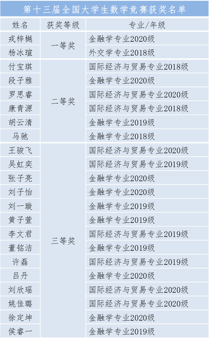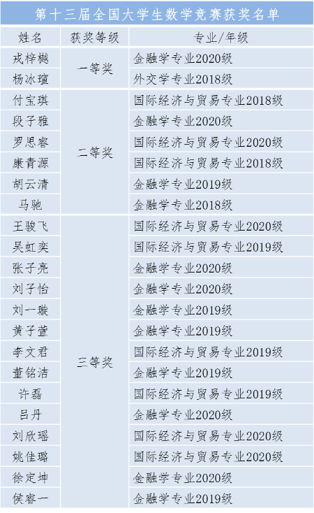 在第十三届全国大学生数学竞赛初赛(非数学类)中,共有22名同学获奖。其中,国际经济学院金融学专业2020级的戎梓樾同学与外交学专业2018级的杨冰瑄同学荣获一等奖,来自国际经济学院的付宝琪、段子雅等6名同学荣获二等奖,国际经济学院王俊飞、吴虹奕等14名同学荣获三等奖。
