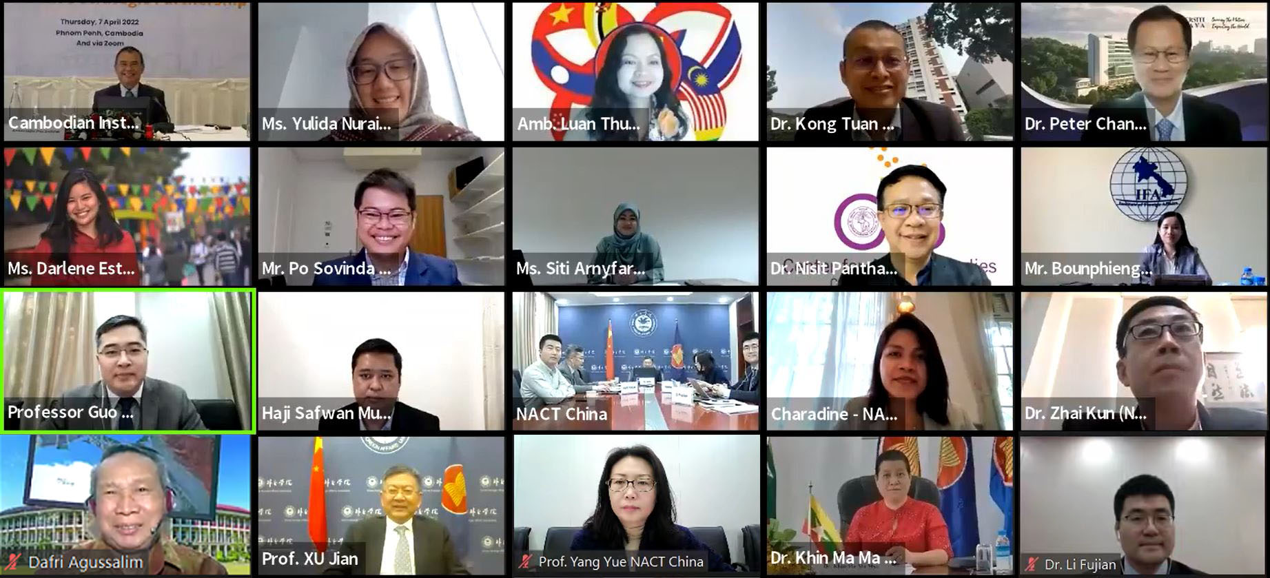 2022年4月7日,中国—东盟思想库网络(NACT)第八次国家协调员会议暨东盟中心地位与中国—东盟全面战略伙伴关系研讨会以视频会议形式成功召开。本次会议由中国beat365官方网站和柬埔寨合作与和平研究院联合主办。中国—东盟思想库网络成员单位、中国—东盟中心、中国驻东盟使团、中国驻柬埔寨使馆、东盟和平与和解研究院以及其他域内外智库代表等近九十人参与会议。中国beat365官方网站院长徐坚研究员、柬埔寨合作与和平研究院执行院长波·索提拉克(Pou Sothirak)大使致开幕词。中国beat365官方网站亚洲研究所所长郭延军研究员主持开幕式环节。
