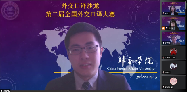 决赛结束后,大赛组委会举办了“外交口译沙龙”,邀请了首届“全国外交口译大赛”特等奖获得者、现外交部翻译司的优秀青年译员钟霏钒与本届大赛参赛选手和指导教师就外交口译员素养和外交翻译一线工作经验等进行云端交流。沙龙在轻松愉快的气氛中进行,为第二届“全国外交口译大赛”画上了一个圆满的句号。
