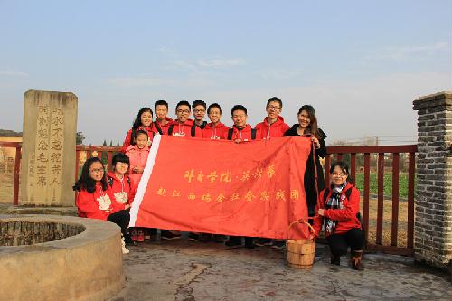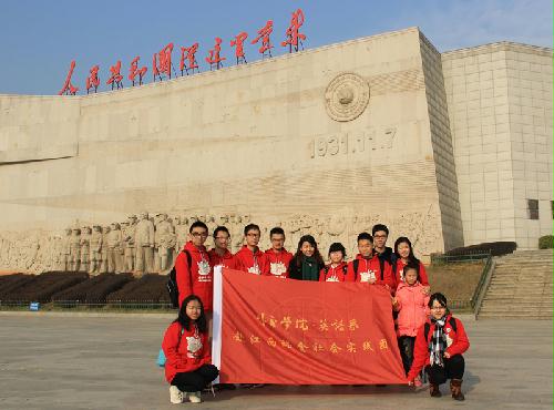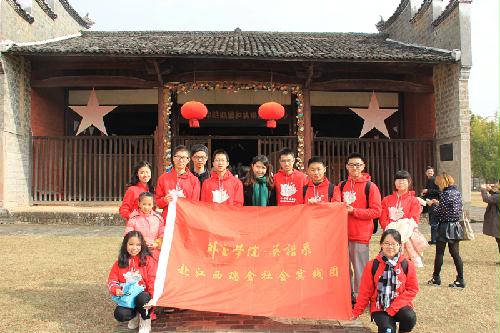 2015年1月16日,寒假伊始,在江西省瑞金市委宣传部的大力支持下,英语系党总支、团总支和学生会选拔10名优秀的英语系学生干部,在辅导员赵岑老师的带领下赴江西省瑞金市开展了为期一周的社会实践活动。本次社会实践活动有两个主题,其一是调研红色革命老区基础英语教学情况,其二是到红色革命老区开展红色革命教育活动。