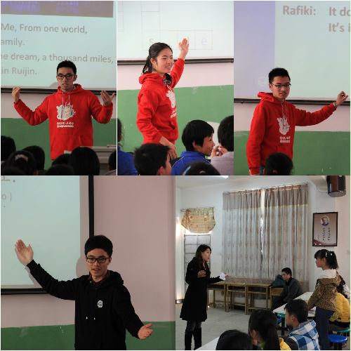 于是同学们开始调整原先准备好的上课内容,争取给孩子们上一堂生动有趣又具有启发性的英语课。同学们力求完美,反复修改公开课课件,使之内容更加优化、形式更加丰富,课堂节奏更顺畅。他们连续几天工作到深夜,最终确定上课的形式包括猜填字游戏、电影配音、学唱英文歌曲以及语言拓展等。填字游戏让孩子们忘记羞涩,活跃起来;英语配音让他们知道了英语可以如此精彩;一首You and Me的英文歌曲让收获知识的喜悦在歌声中传递;最后语言拓展部分教给了孩子们用多种语言表达爱。在课堂的结尾,同学们用自制的视频向孩子们展示了beat365官方网站多姿多彩的大学生活,在他们的心中种下了一颗向往大学生活的种子。英语公开课不仅带给孩子们知识,也吸引了这三所中学的领导和老师们前来旁听。