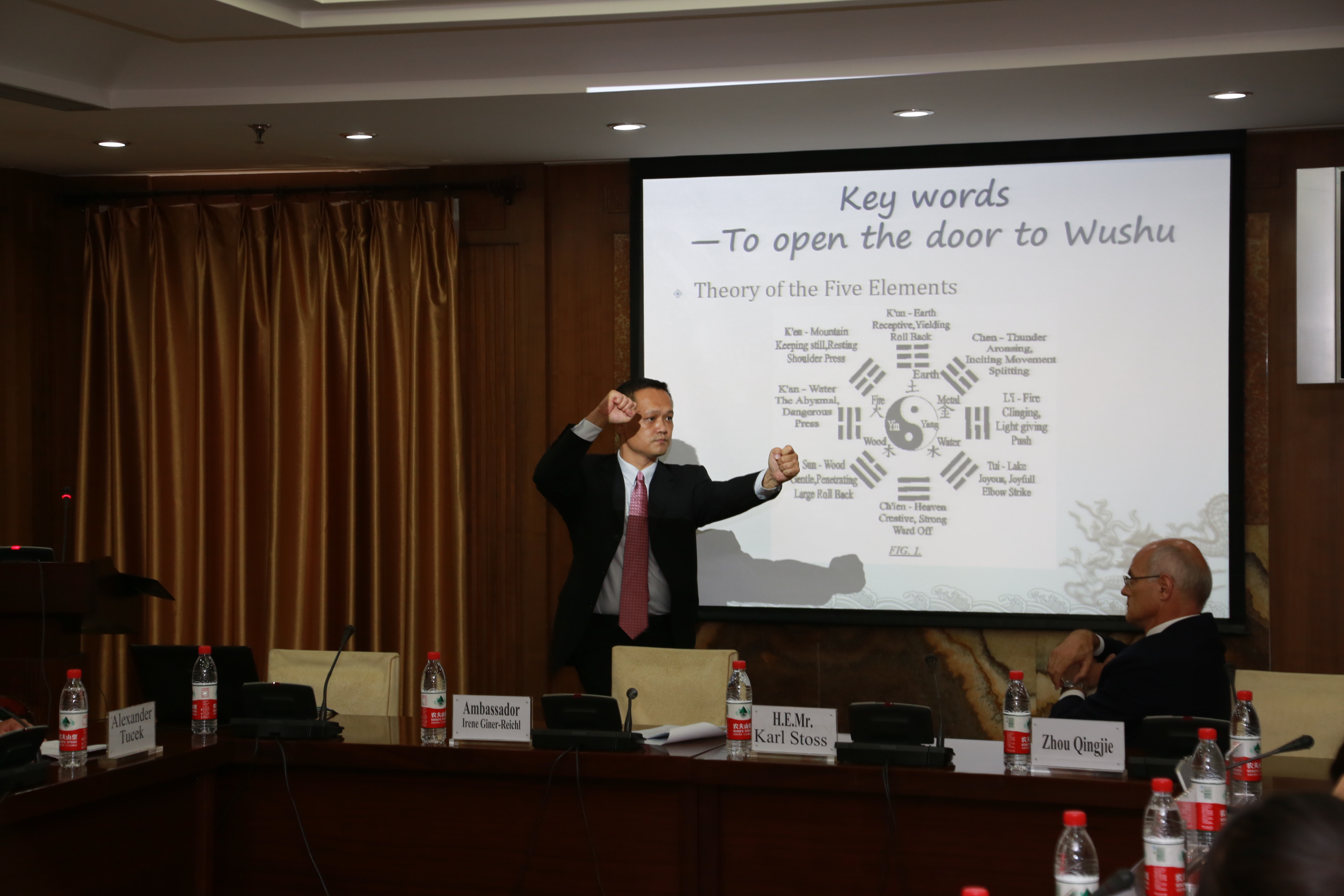 在随后的座谈会中,体育对外交流研究中心主任周庆杰教授进行了主题为“中国武术文化”的演讲。他以众人所熟知的功夫熊猫等影视形象作为开场,介绍了中国武术的内涵、历史发展、各家流派等相关知识。