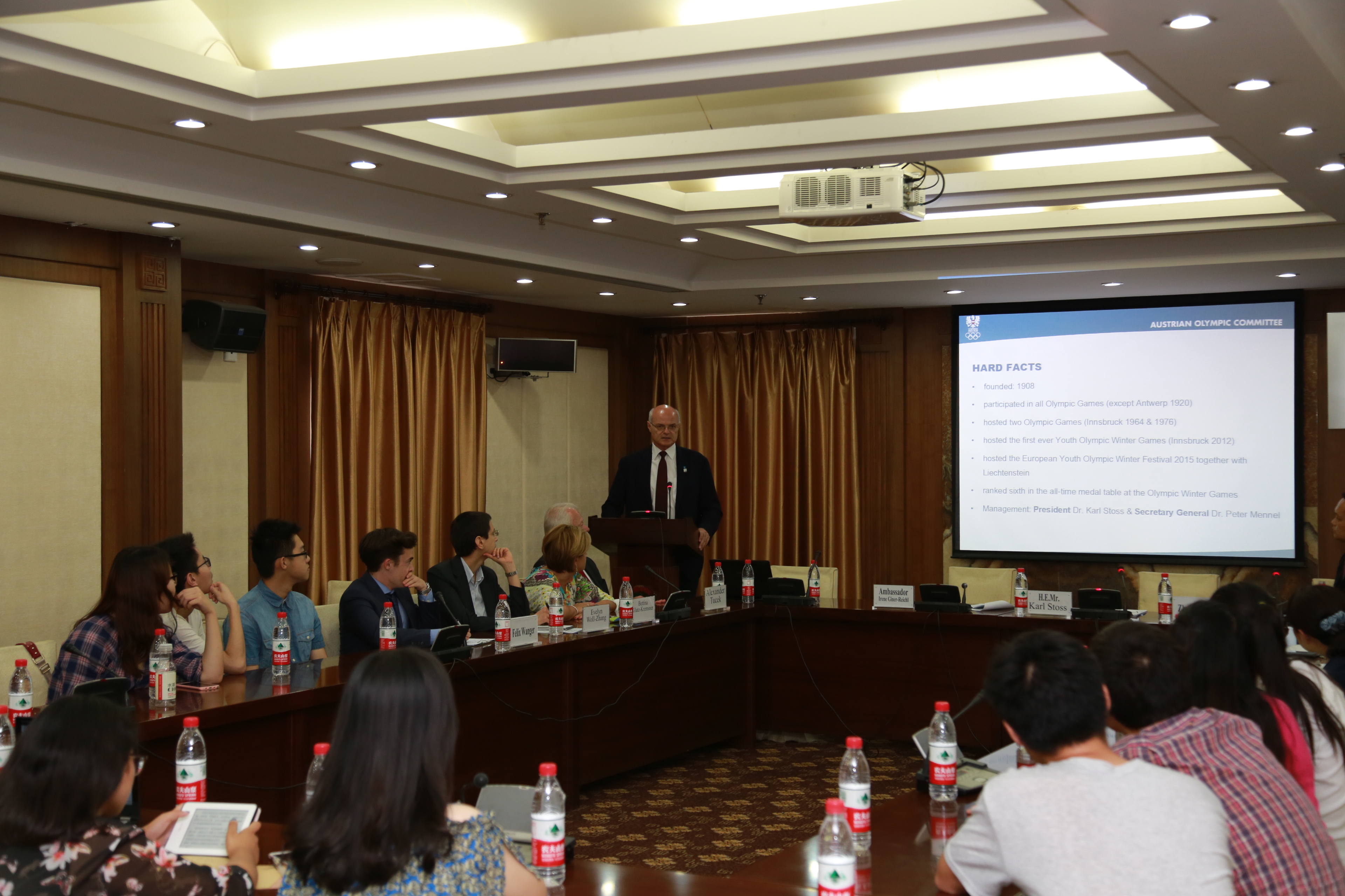 施多斯主席也发表了演讲。他从奥地利奥委会管理模式、冬季运动发展、体育法、体育资金等多个方面介绍了奥地利体育事业的发展现状。