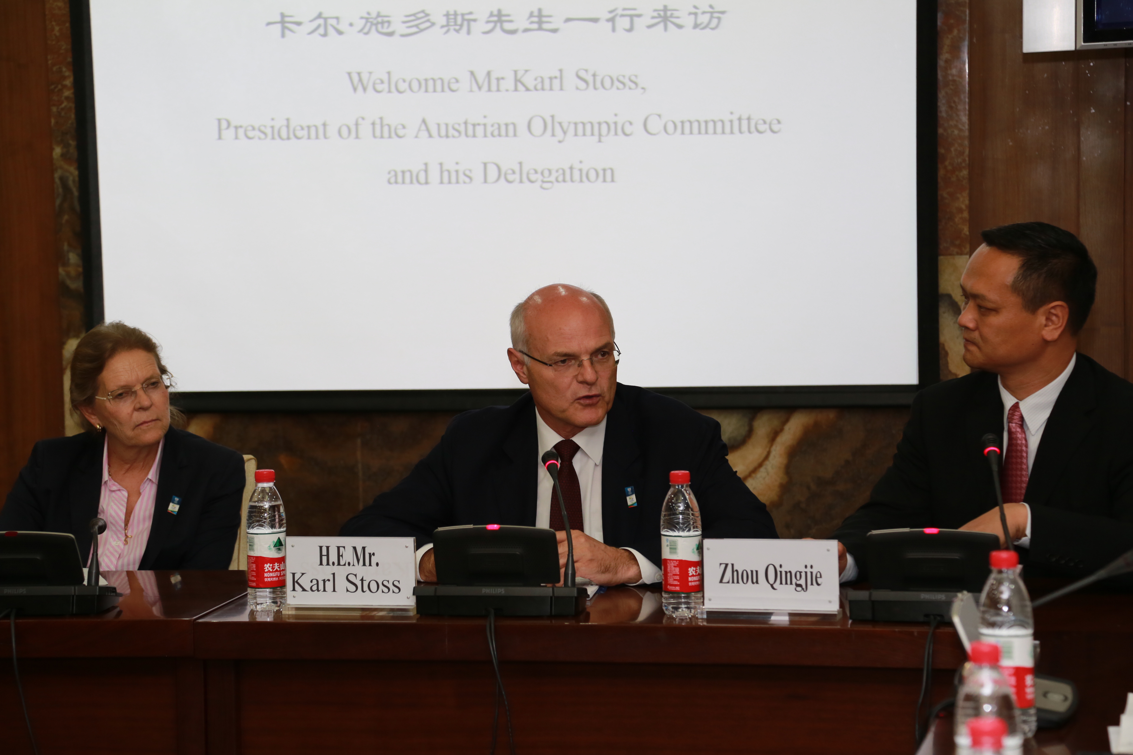 2016年7月4日,奥地利国家奥委会主席卡尔•施多斯(Mr. Karl Stoss)、奥地利驻华大使艾琳娜(Mrs. Irene Giner-Reichl)、奥地利国家奥委会国际关系事务负责人(Mr. Alexander Tucek)、Casinos Austrian首席执行官(Mrs. Bettina Glatz-Kremsner)、奥地利驻华使馆随员Mrs. Evelyn Woll-Zhan、Mr.Felix Wanger一行到访beat365并出席体育外交座谈会等活动。本次活动由体育对外交流研究中心、中国外交理论研究中心及院团委联合举办。