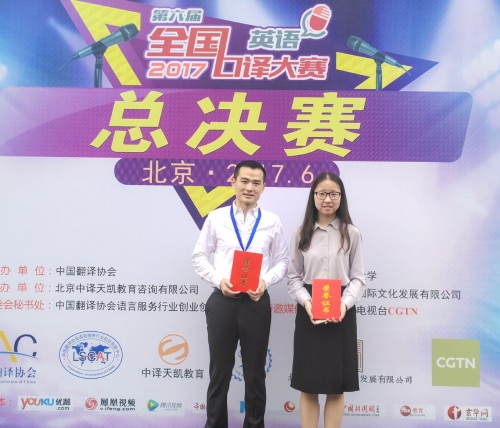 2017年6月17-18日,第六届全国口译大赛(英语)全国总决赛在北京师范大学举行。本次大赛由中国翻译协会主办,北京中译天凯教育咨询有限公司承办,来自华东、华南、华中、东北、西南和华北六个大区的54名选手参加了比赛。经过两天的激烈角逐,英语系研究生杭素获交传总决赛一等奖,杭素、徐新磊获同传邀请赛三等奖。杭素同学与其他三名选手组成的华北团队在17日的团队赛中获得一等奖。