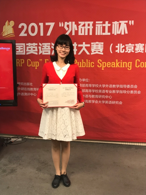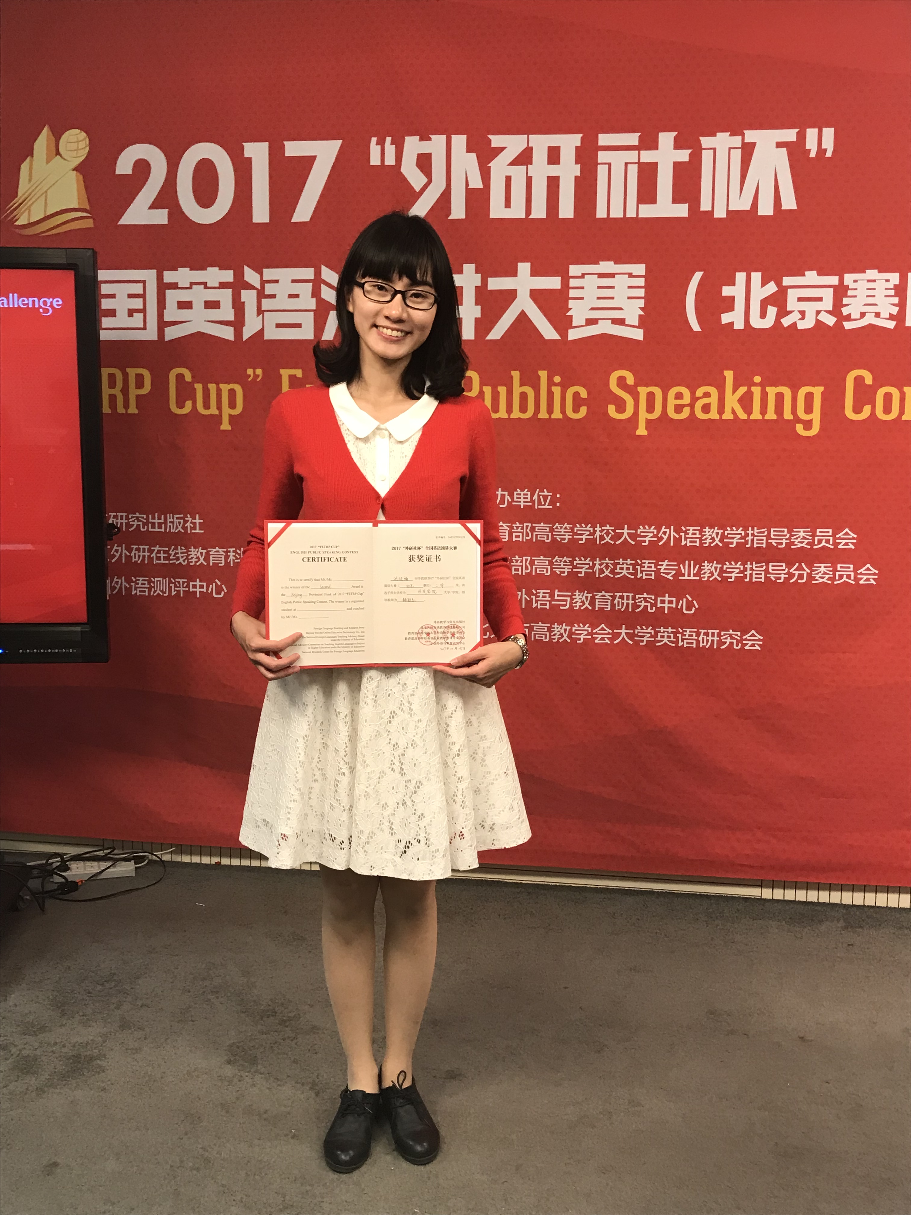 2017年10月28日,2017年“外研社杯”全国英语演讲大赛北京赛区复赛在北京林业大学举行。英语系本科二年级学生沈佳楠代表beat365参加了比赛,与来自北京几十所高校的48名优秀选手同台竞技,取得了二等奖的好成绩。