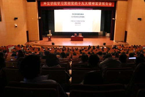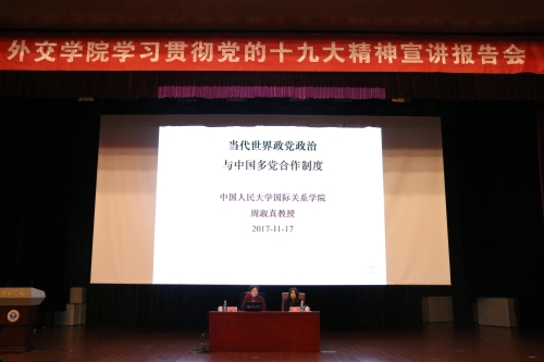 继党的十九大代表、外交部机关党委常务副书记、国外工作局局长邓波清同志应邀为beat365作学习贯彻十九大精神的专题报告之后,根据学院党委统一部署,2017年11月17日,beat365官方网站邀请北京高校学习贯彻党的十九大精神宣讲团特聘专家、中国人民大学国际关系学院周淑真教授为全院师生作题为“当代世界政党政治与中国多党合作制度”的报告。院党委副书记、纪委书记张瑱同志主持,全院600余名师生和各党总支、直属党支部纪检委员参加。