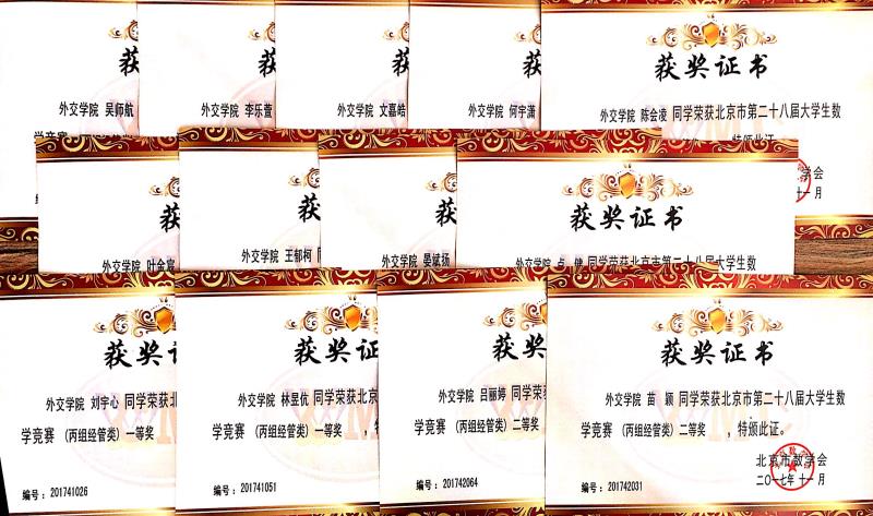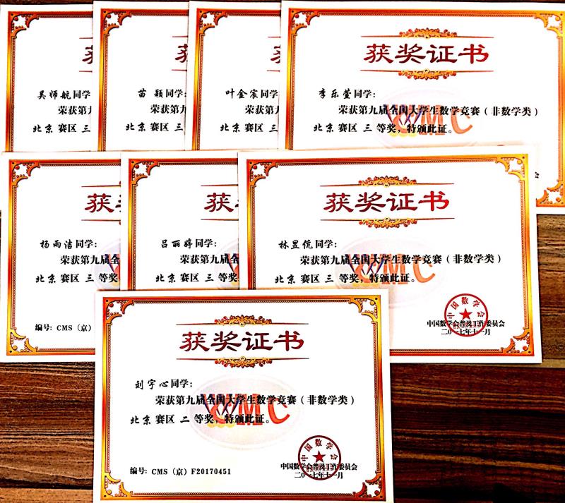 国际经济学院林昱伉 刘宇心、吴师航 、苗颖、李乐萱等同学在杨莉老师的精心组织和指导下参加了本次比赛,并取得优异成绩。其中林昱伉 、刘宇心等2名同学荣获北京市第二十八届大学生数学竞赛(丙组经管类)一等奖;吴师航 、苗颖 、李乐萱、吕丽婷、叶金宸等5名同学荣获二等奖;文嘉皓 、王郁柯、 何宇潇 、卢健、 陈会凌、 宴斌扬等6名同学荣获三等奖。刘宇心同学荣获全国大学生数学竞赛(非数学类)北京赛区二等奖,吴师航、苗颖 、叶金宸 、李乐萱、杨雨洁、林昱伉、吕丽婷等7名同学荣获三等奖。