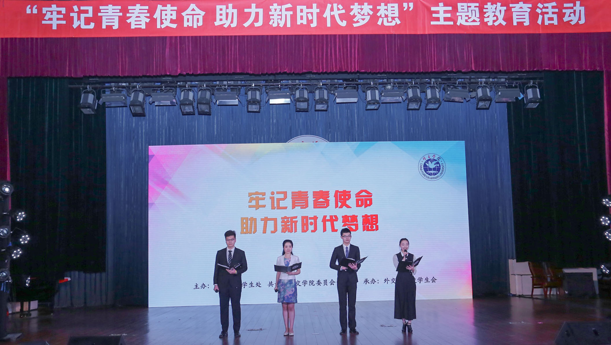 为深入学习贯彻党的十九大精神和习近平新时代中国特色社会主义思想,进一步贯彻落实全国高校思想政治工作会议和《中共中央国务院关于加强和改进新形势下高校思想政治工作的意见》的精神,充分发挥榜样育人作用,积极推进大学生思想政治教育工作,培养担当民族复兴大任的时代新人,教育学生时刻牢记外交使命,为奉献新时代中国特色大国外交,实现中华民族伟大复兴的中国梦贡献青春力量,2018年3月28日,学生处、团委在沙河校区礼堂举办“牢记青春使命 助力新时代梦想”主题教育活动。beat365官方网站秦亚青院长、孙吉胜副院长、李洪梅副院长、高飞院长助理出席主题教育活动。