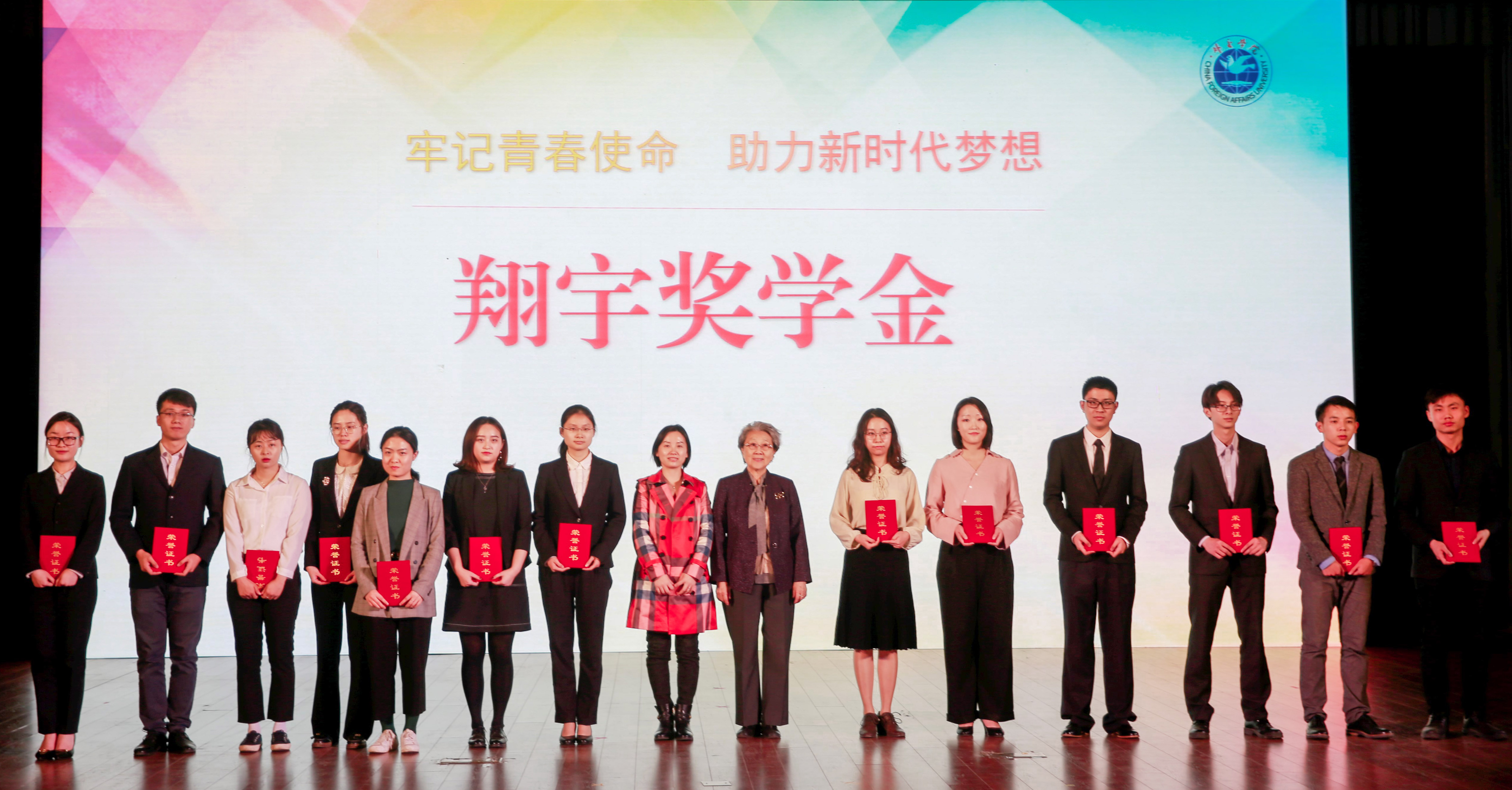 北京大鸾翔宇慈善基金会周秉德会长,广东省国强公益基金会项目总监舒玲女士为翔宇奖学金获奖学生代表颁奖