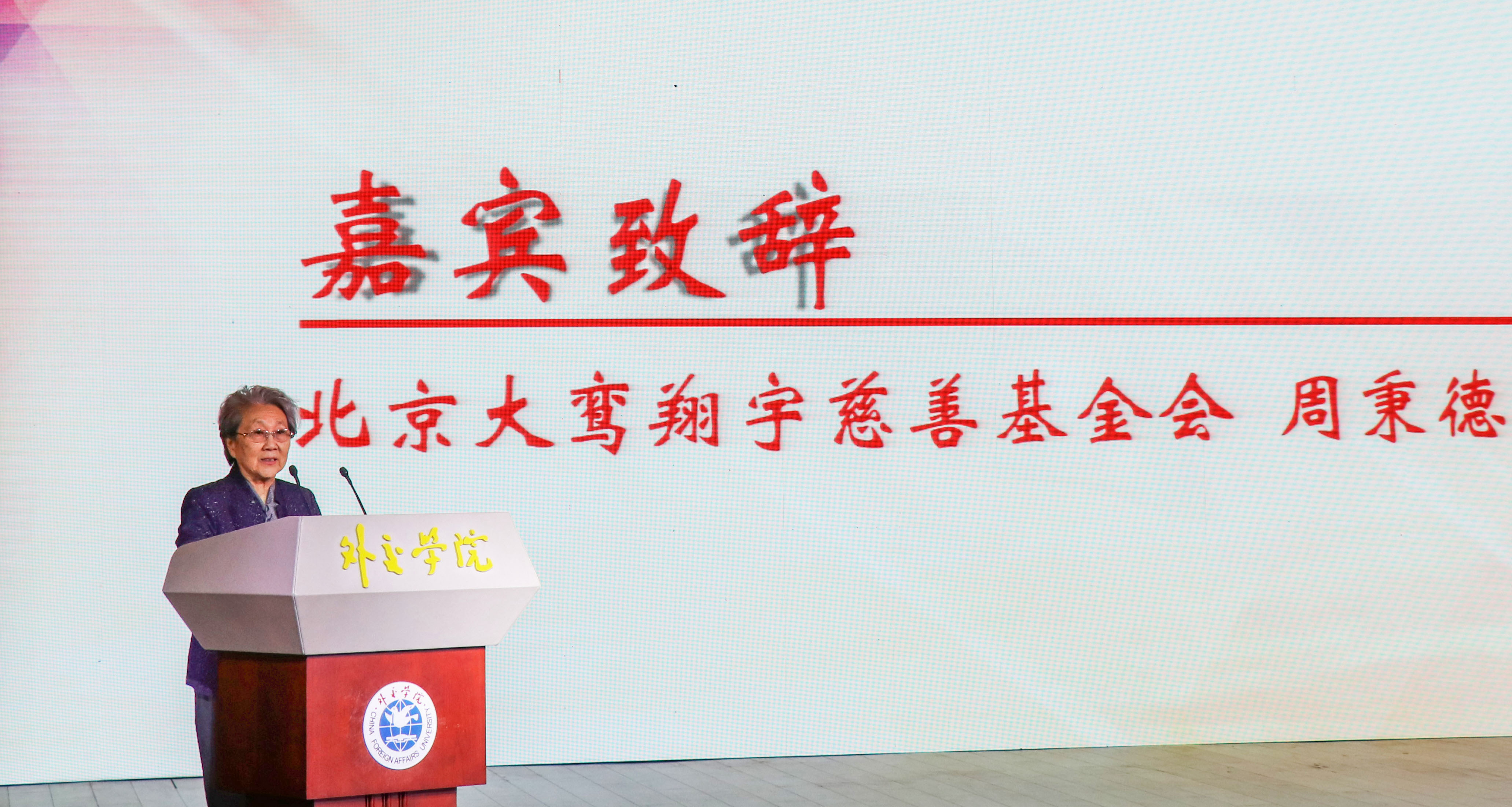 北京大鸾翔宇慈善基金会周秉德会长致辞,她表示在beat365官方网站设立翔宇奖学金是为了纪念周恩来总理,奖励优秀学生坚定信念、认真学习、提升品格,投入到神圣的外交事业。她说周恩来总理与beat365有着深厚密切的联系,beat365官方网站是外交官的摇篮,都是国家的栋梁,希望大家珍惜来之不易的学习机会,进一步学习周总理的品格,弘扬周总理的精神,肩负起祖国赋予大家的重任。