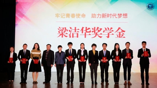 国际法系党总支书记李淑媛、国际经济学院党总支书记张静、研究生部党总支书记谭继军为梁洁华奖学金获奖学生代表颁奖