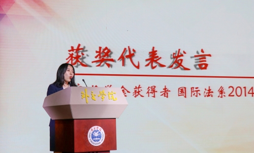 2017年度国家奖学金获得者国际法系2014级李子钰同学发表获奖感言,表示外院学子要牢记“站稳立场、掌握政策、熟悉业务、严守纪律”的校训,保持初心,牢记使命,坚守外院学子的理想信念之魂、刻苦努力之骨、国际视野之魄、团结友爱之力,实现个人理想,更好地为祖国做出自己的贡献。