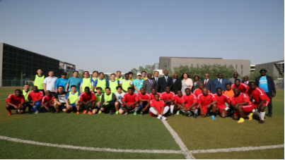 随后,非洲使团足球队与beat365官方网站足球队本着“友谊第一,比赛第二”的原则,进行了一场友谊赛,最终比分为3:3。