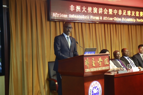大使演讲环节由周庆杰教授主持。首先发言的卢旺达驻华大使H.E Mr.Charles Kayonga强调,非洲在各项事业的发展上已经取得了长足的进步。非洲人口快速增长,因此非洲有着巨大潜力。同时,他也指出了当下非洲存在的一些问题,例如非洲还需要建立统一的航空运输网络——目前,从非洲国家间的航线常需要经欧洲中转,这些愿景的实现都需要非洲和中国之间的进一步合作。