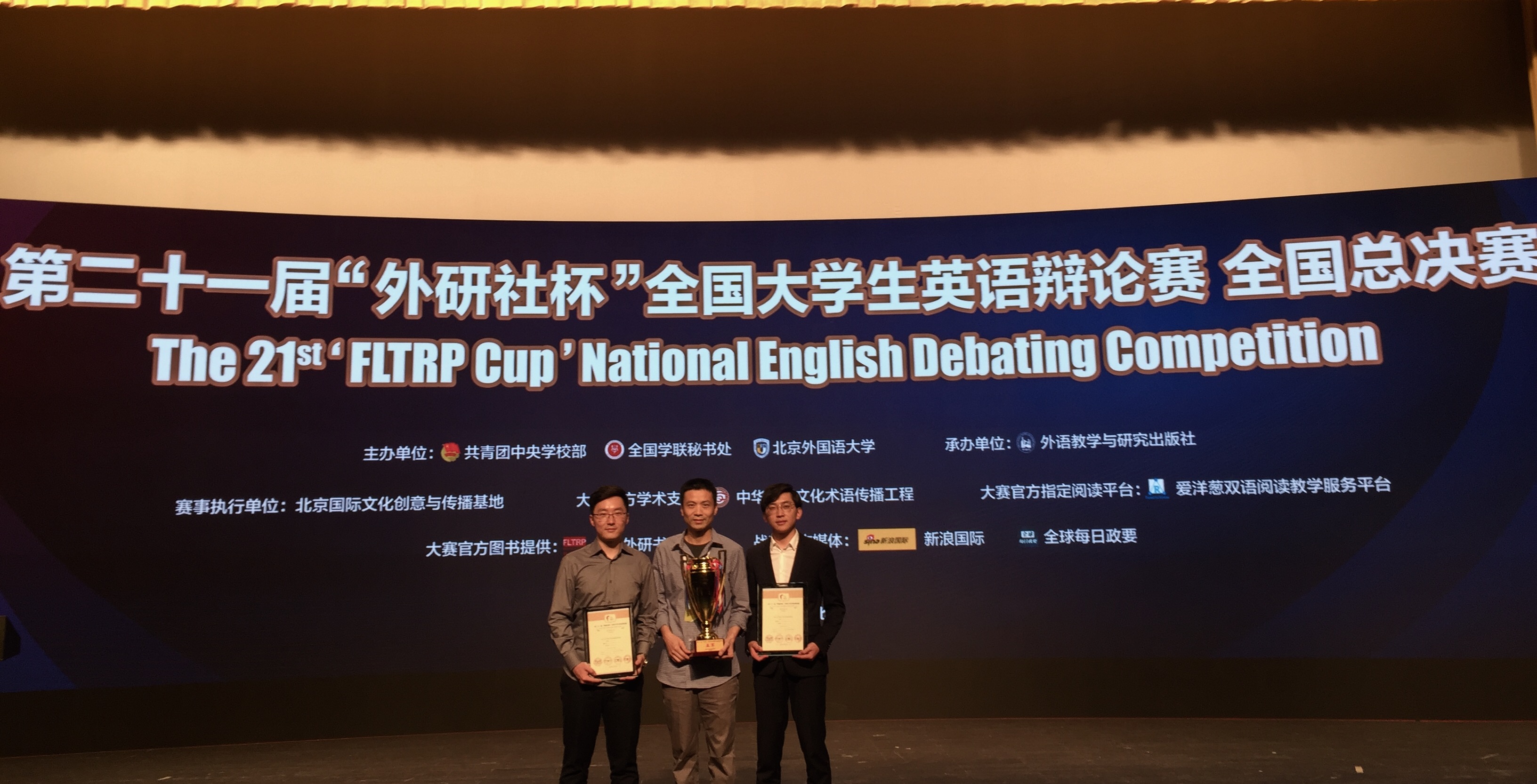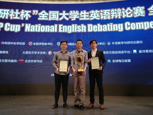 第二十一届“外研社杯”全国大学生英语辩论赛全国总决赛于2018年5月17日至22日在北京外国语大学举行,英语系2014级本科生杜泽东、王俊良代表beat365官方网站参赛。经过接近一周的激烈角逐,两位同学凭借缜密的推理分析能力、出色的应变能力、流利诙谐的英语表达、精湛的辩论技巧一路过关斩将,最终获得全国总决赛的亚军。这是继2015、2016连续两年英语系学生马知遥和苏雨欣、李纪为和杨清茹蝉联“外研社杯” 全国大学生英语辩论赛全国总决赛冠军之后再次取得的优异成绩。特此向两位同学、指导教师杨强及英语系创新实践训练中心英语辩论指导团队表示热烈祝贺!