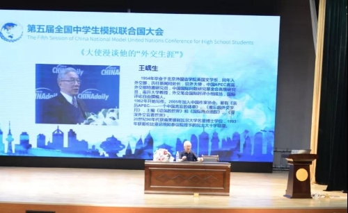大会还邀请曾担任亚太经合组织高官、中国驻尼日利亚大使、中国驻哥伦比亚大使的资深外交官王嵎生先生和世界卫生组织前外交官、联合国改革与伙伴关系前协调员、原卫生部外事司司长宋允孚先生分别围绕“当前国际形势的一些热点问题”和“培养家国情怀、筑梦国际组织”作讲座。