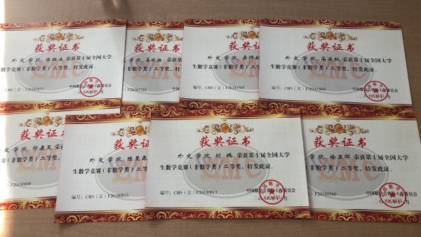 国际经济学院及英语系、外语系徐亚晖、刘鹏、陈至霖、祈康昊、陈瑛佳等同学在杨莉老师和曹胜玉老师的精心组织和指导下参加了本次比赛,并取得优异成绩。其中徐亚晖、刘鹏、陈至霖、祈康昊(英语系)等4名同学荣获全国大学生数学竞赛(非数学类)二等奖,吴师航、晏斌扬、高凌枫、陈瑛佳(外语系)等4名同学荣获三等奖。