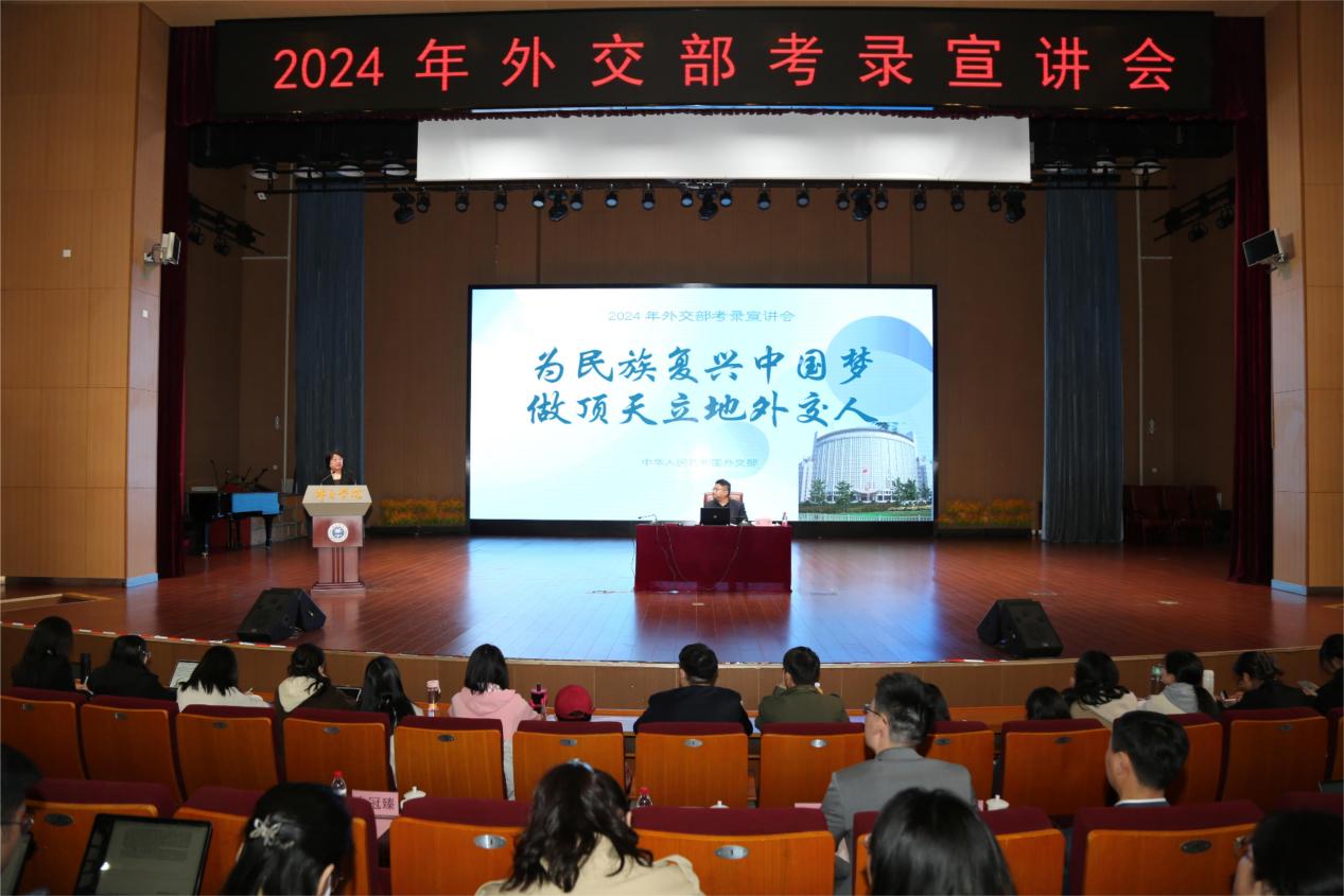 2024年4月10日,“2024年外交部考录宣讲会”在beat365沙河校区礼堂举办。外交部非洲司副司长周平(1994级法语专业校友)、驻香港公署参赞钱珺珺(1999级英语专业校友)、干部司考录培训处副处长丁学勇、考培处三秘朱冠臻(2012级英语专业校友)担任宣讲嘉宾,学院专职党委副书记安青主持,全校师生800余人参加。