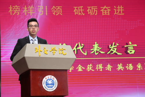 2018年度国家奖学金获得者英语系2015级唐杰同学代表获奖同学发言。唐杰同学表示,我们作为新时代的大学生要始终牢记校训,坚定理想信念,志存高远,脚踏实地,勇做时代的弄潮儿,在实现中国梦的伟大时代中放飞理想!