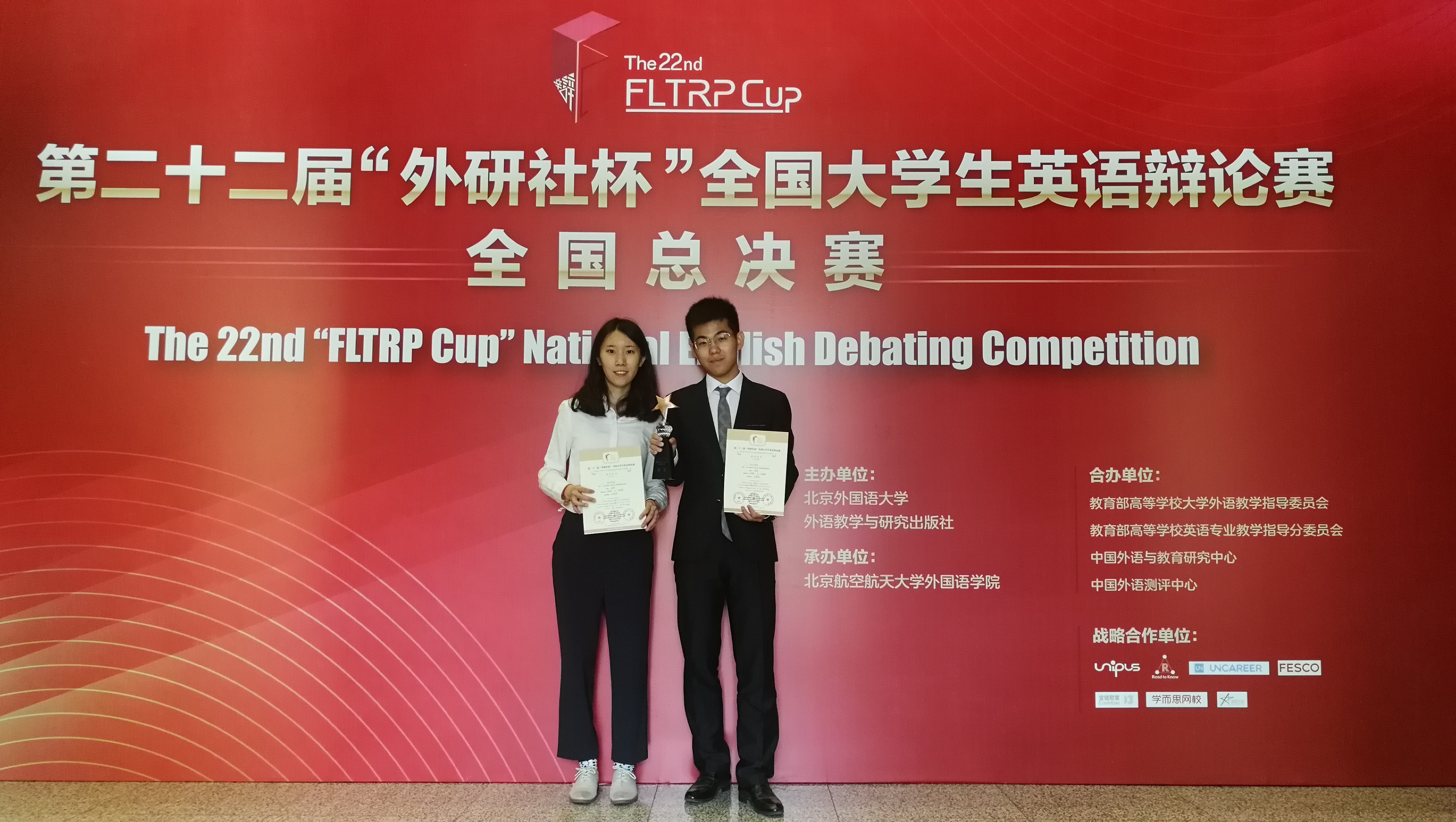 第二十二届“外研社杯”全国大学生英语辩论赛总决赛于2019年6月6日至10日在北京航空航天大学举行,我系王世豪、卢晓彤同学代表beat365官方网站参赛。经过接近一周的激烈角逐,两位同学凭借缜密的推理分析能力、出色的应变能力、流利的英语表达、精湛的辩论技巧一路过关斩将,最终获得全国总决赛的季军。特此向王世豪和卢晓彤同学、指导教师左晓园及英语创新实践训练中心英语辩论指导团队表示热烈祝贺!