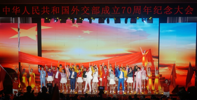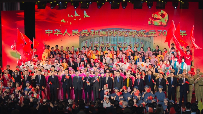 11月8日,中华人民共和国外交部成立70周年纪念大会隆重举行。国务委员兼外交部长王毅、外交部党委书记齐玉、中央和国家机关工委李勇副书记、人力资源与社会保障部张义全副部长以及在京部领导、部内部属单位代表、在京驻外使节、离退休老同志代表等共约700人参加。