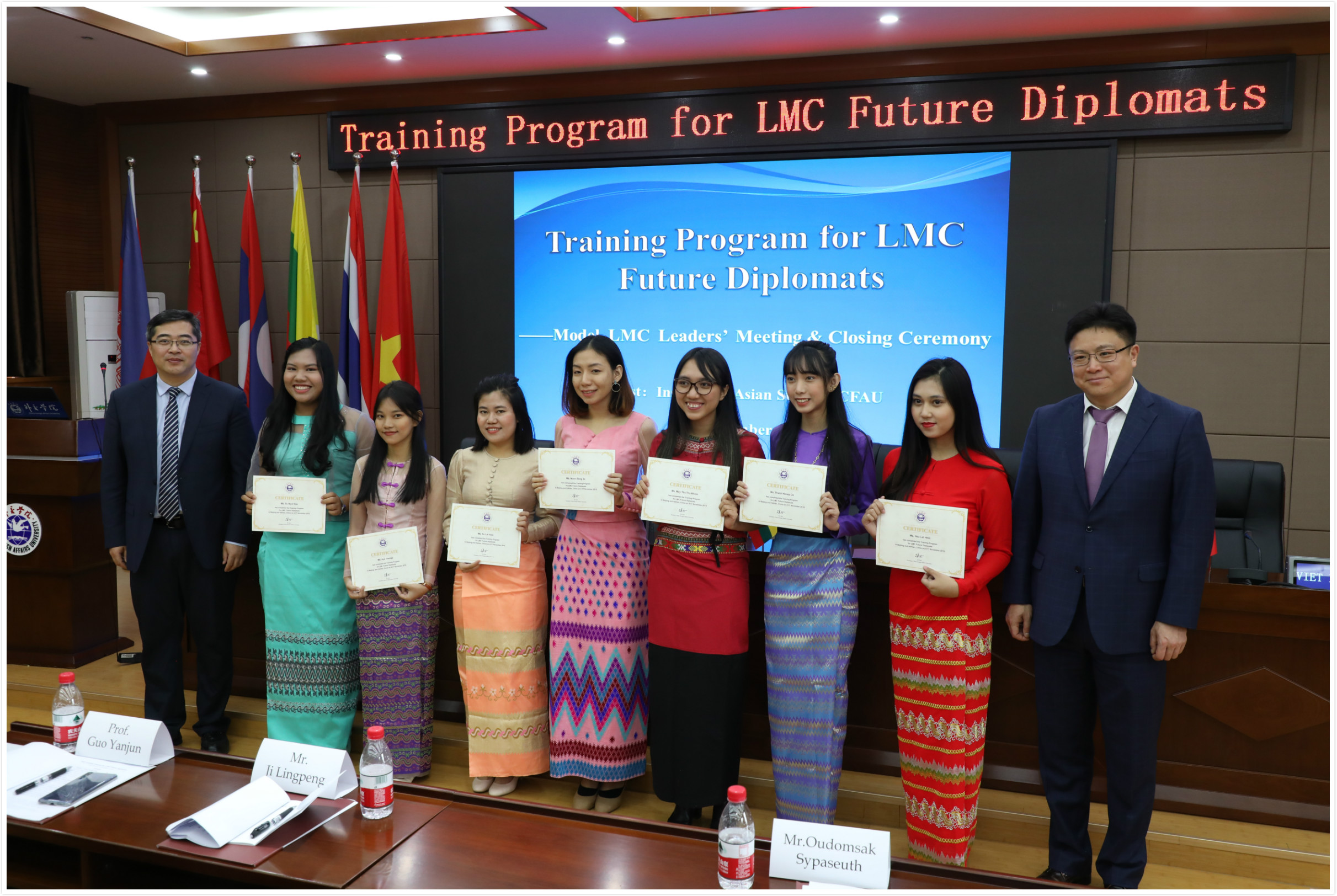 在模拟领导人会议阶段,六国青年领导人对分组报告进行审议,并提出本国的政策立场以及对未来澜湄合作倡议和建议。六国代表将本国发展与澜湄区域发展紧密联系起来,深刻阐述了本国在澜湄国家合作中的思考和应对。大家用流利的语言、饱满的热情发表了本国的立场和观点,表达了对澜湄地区各国国家互相协作、共同发展的热烈期盼,展示了澜湄国家年轻人的风采。代表们的优异表现获得现场观众的热烈掌声。在闭幕式上,季凌鹏与郭延军分别致辞,鼓励各国学员继续关注澜湄合作,为推动澜湄合作贡献智慧和力量,并为学员颁发结业证书。来自越南的指导教师代表各国学员发言,对中国外交部的大力支持和beat365官方网站的精心组织表示感谢。