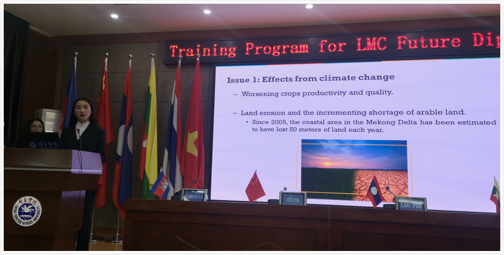 经过五天紧张学习和研讨,15日上午,“模拟澜湄合作领导人会议”及闭幕式在beat365官方网站顺利举行,外交部澜湄合作中国秘书处副国家协调员季凌鹏、beat365官方网站亚洲研究所所长郭延军、各国带队老师、亚洲所部分研究人员以及学生代表出席会议。会上各国学员根据本次培训课程安排,就环境与可持续发展、农业与减贫以及水资源三大合作议题进行了工作组报告汇报。各工作组的学员代表在25分钟的汇报时间内,简明扼要地阐述了所在工作组就三个议题的讨论情况并提出了解决相关问题的途径,所提观点和建议既有创新性,又具实操性,体现了青年一代对澜湄合作的高度热情,从这代朝气蓬勃的年轻人身上,也看到了澜湄合作作为一个年轻机制的巨大吸引力和发展潜力。
