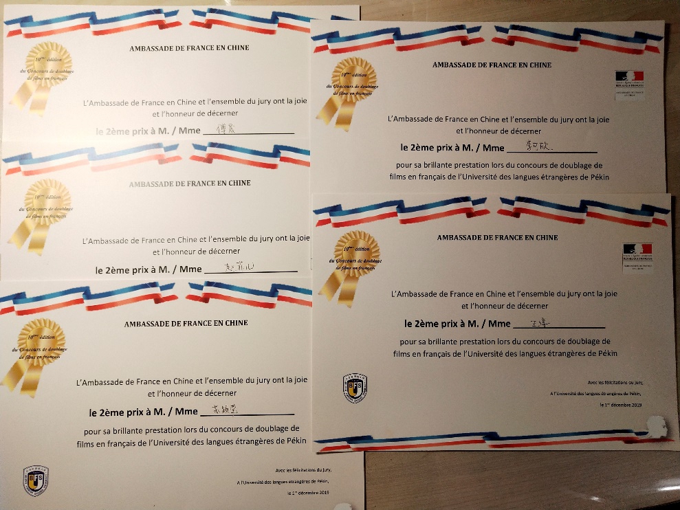2019年12月1日,第十届全国高校法语电影配音大赛决赛在北京外国语大学举办。初选阶段,经过校内的激烈角逐,外语系最终选拔出傅晟、王淳、赵菲儿、李可欣、苏颖莹五位同学代表beat365官方网站参赛,同来自北京大学、北京外国语大学、浙江大学等多所高校的16支参赛队伍在决赛的赛场上展开较量,并取得全国二等奖的佳绩。