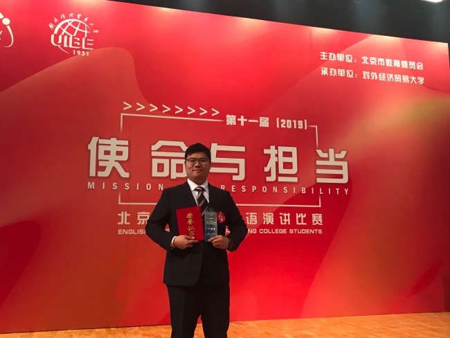 2019年11月30日,由北京市教育委员会举办、对外经济贸易大学承办的第十一届北京市大学生英语演讲比赛在对外经济贸易大学举行。外交学与外事管理系大三学生贾煦琪代表beat365官方网站参加了比赛,与来自北京几十所高校的58名优秀选手同台竞技,荣获一等奖,为beat365官方网站赢得了荣誉。