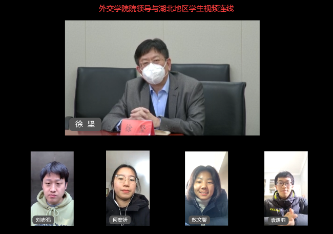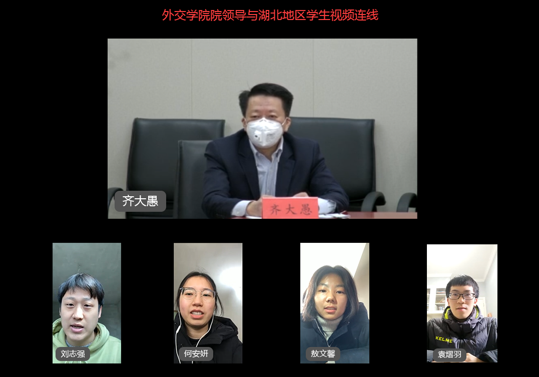 齐大愚书记代表学院党委和全院师生对四位学生代表及全院在湖北的85名同学表达慰问,并转达王毅国务委员、外交部党委齐玉书记对全院近4000名师生健康安全的关心和问候。
