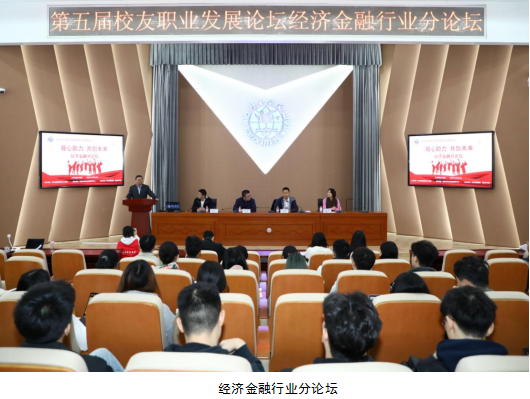 国际经济学院院长欧明刚教授、李涛讲师、辅导员侯颖茜出席经济金融行业分论坛。宁波君度私募基金投资有限公司投资总监苏健、中国建设银行总行业务经理冯聪、海德资本合伙人张一、以明科技创始人兼CEO潘望4位校友热情分享。