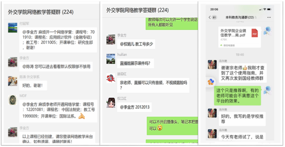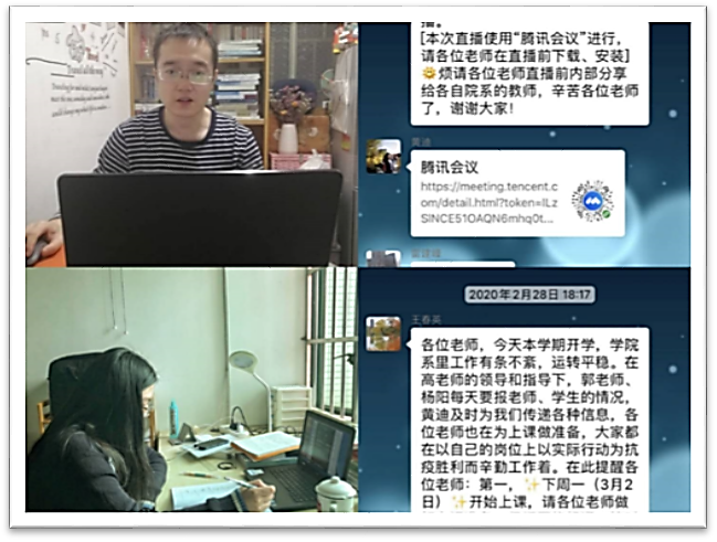 英语系教师结合授课程特点、学生需求、网络硬件及软件条件等因素,采取了企业微信会议模式直播课程,利用微信群语音讲座/答疑+微视频,利用网络学堂录播课/课程资源+微信群讨论/答疑等三种形式开展线上教学。图3为英语系梅琼老师和张蕾老师视频直播,杨柳老师企业微信授课,许宏晨老师微信群授课。