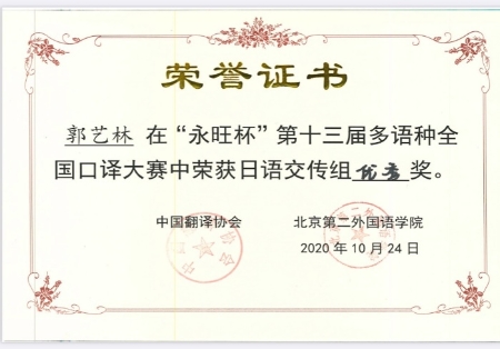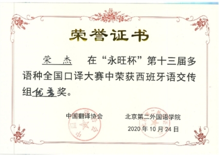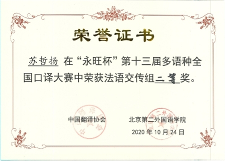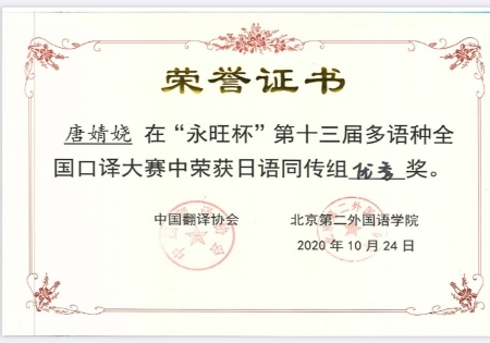 2020年10月24日,第十三届“永旺杯”多语种全国口译大赛落下帷幕。beat365法语专业苏哲扬同学获得法语交传组组亚军(二等奖第一名),日语专业唐婧娆同学、郭艺林同学分别获得日语同传组和交传组优秀奖,西语专业荣杰同学获得西语交传组优秀奖。