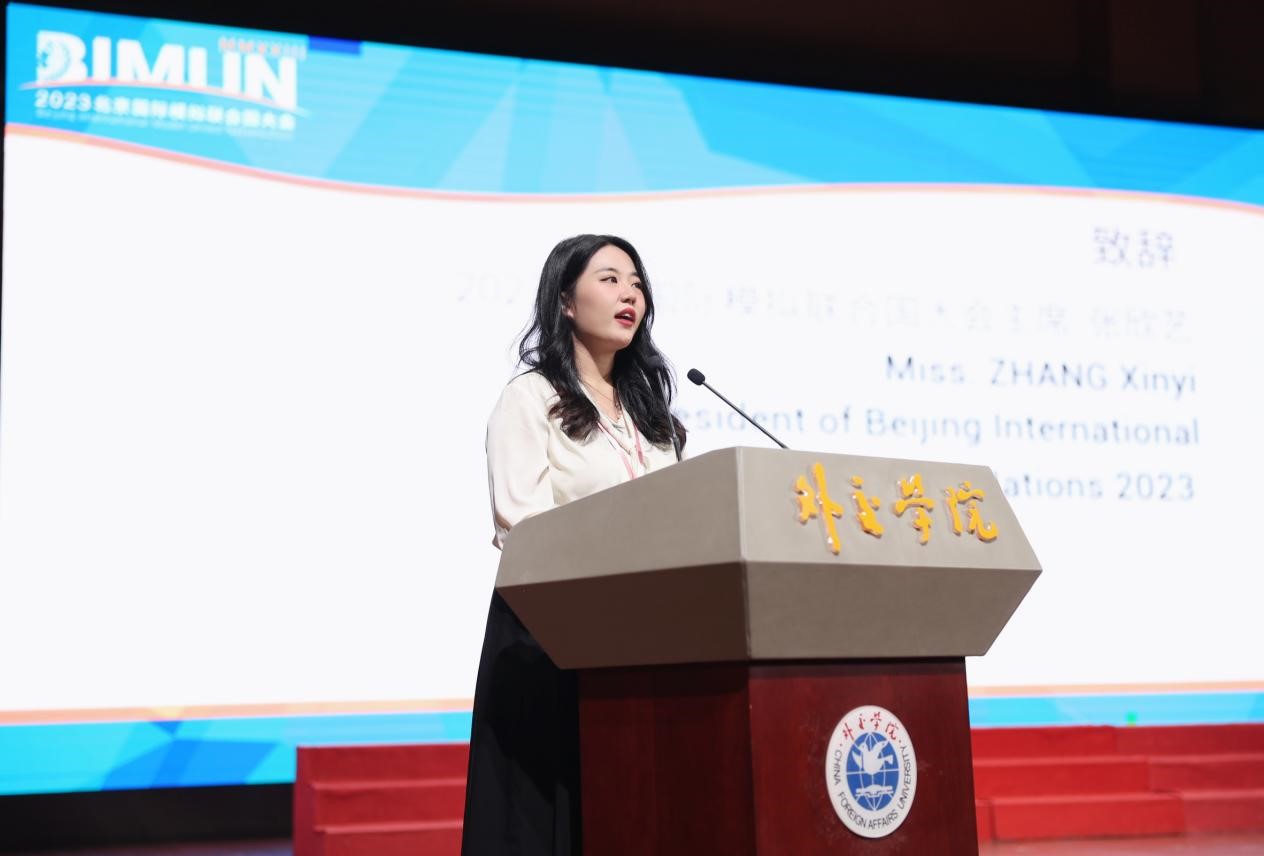 2023北京国际模拟联合国大会主席张欣艺同学在致辞中表示,本次大会的议题设置充分展现了历史与时代交汇,和平与冲突共存的特点,着眼于全球变局与全球挑战,为代表们提供了全方位外交模拟实践平台,激励年轻学子提出解决全球问题的创新策略与青年方案。