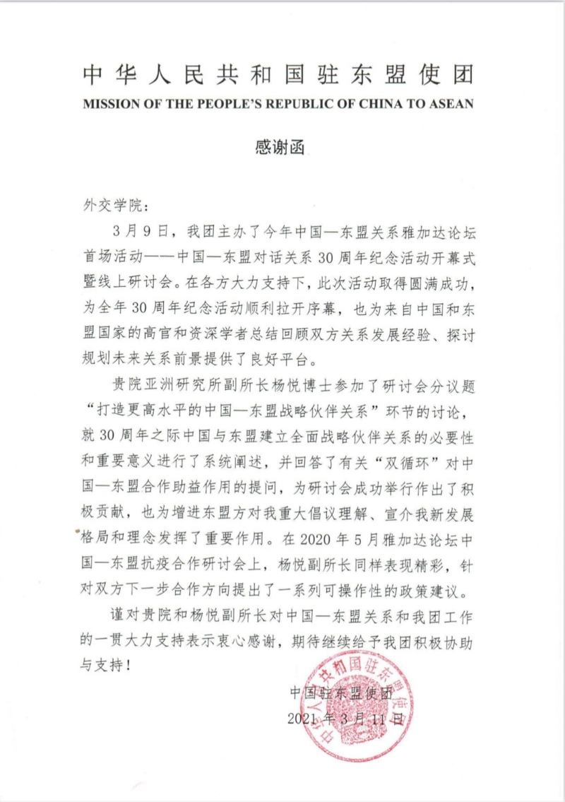 感谢函表示,亚洲研究所副所长杨悦副教授参加了3月9日使团主办的2021年中国—东盟关系雅加达论坛首场活动——中国—东盟对话关系30周年纪念活动开幕式暨线上研讨会,并在“打造更高水平的中国—东盟战略伙伴关系”分议题环节做了主题发言,还回答了与会者有关“双循环”对中国—东盟合作助益作用的提问,为研讨会成功举行做出了积极贡献,也为增进东盟方对我重大倡议理解、宣介我新发展格局和理念发挥了重要作用。在2020年5月雅加达论坛中国—东盟抗疫合作研讨会上,杨悦副所长同样表现精彩,针对双方下一步合作方向提出了一系列可操作性的政策建议。