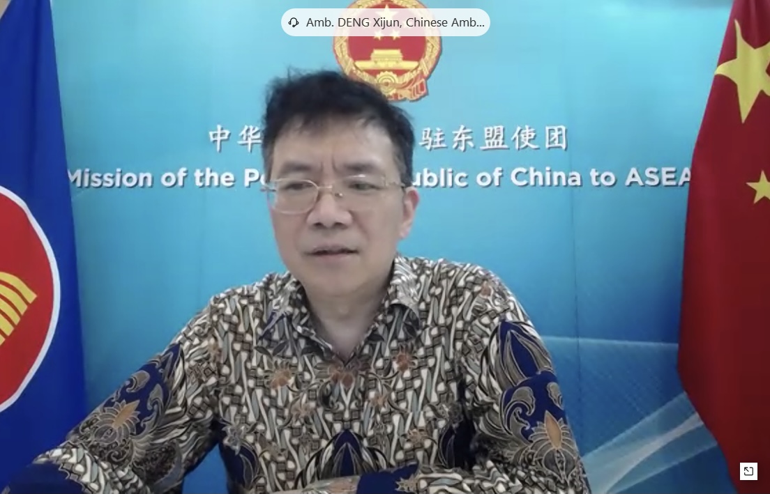 在主旨演讲环节中,中国驻东盟使团邓锡军大使从政治沟通、抗疫合作、经贸往来、互联互通、人文交流等方面对中国—东盟合作进行了系统梳理。他表示,前所未有的疫情挑战彰显了中国—东盟关系的韧性和实质性。邓大使还对智库网络在中国—东盟关系中发挥的特殊作用表示赞赏,希望本地区智库继续发挥好桥梁纽带作用,正确引导舆论,为双边关系长远发展建言献策。