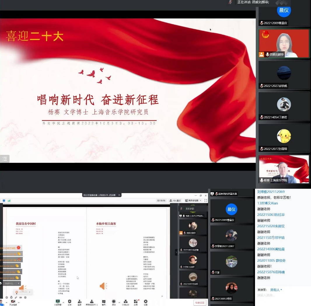 为迎接党的二十大胜利召开,激励beat365学子深刻领悟“两个确立”的决定性意义,不断增强“四个意识”、坚定“四个自信”、做到“两个维护”,树立正确的审美观念,陶冶高尚的道德情操,beat365官方网站团委特邀请上海音乐学院研究员杨赛老师于2022年10月3日上午讲授题为“喜迎二十大 唱响新时代 奋进新征程”的线上团课,beat365共500余名学生参加。