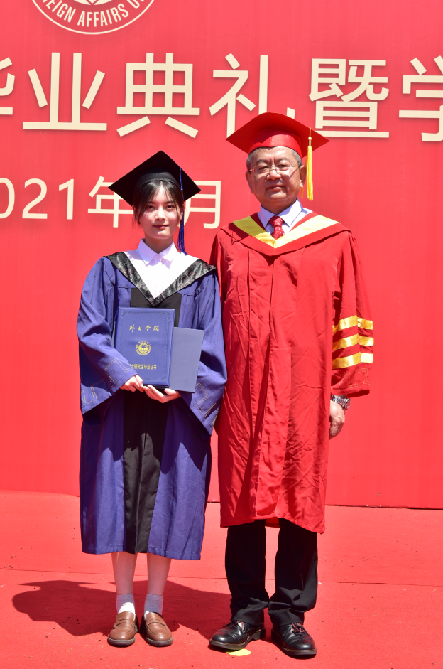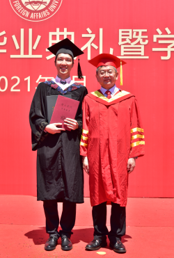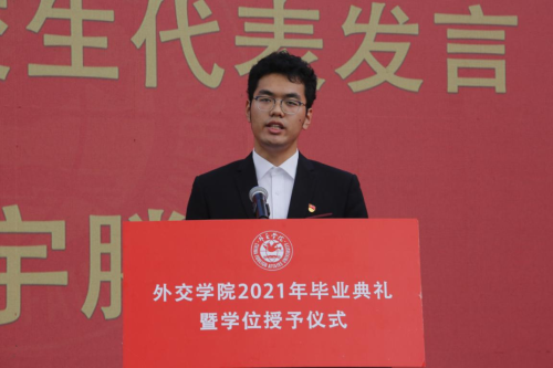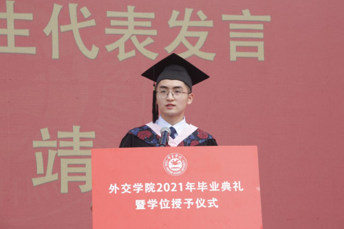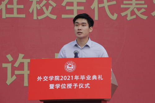研究生部外交学专业许志远同学作为研究生在校生代表发言,向2021届以优异成绩顺利完成学业的研究生学长学姐们、本科学弟学妹们,表达最热烈的祝贺,最真挚的祝福。表示在校生将汲取榜样力量,接续前辈努力,坚定理想信念,站稳人民立场,牢记初心使命,练就过硬本领,将自己的小我融入到祖国的大我之中,与时代同步伐、与人民共命运,书写个人无悔青春,谱写祖国壮丽篇章。